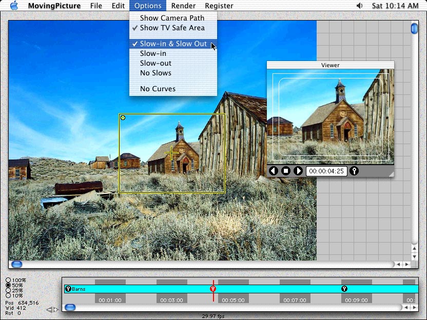 MovingPicture is very simple to use. The image appears on the screen. Dragging and sizing a framing box icon on top of this image changes the view, adding key frames onto the timeline.